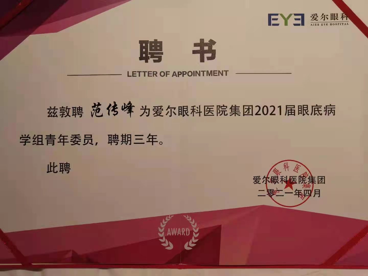 ? ? ? ? 日前,泰安光明愛爾眼科醫(yī)院范傳峰院長在愛爾眼科集團(tuán)換屆選舉的新一屆眼底病學(xué)組中,當(dāng)選為青年委員。