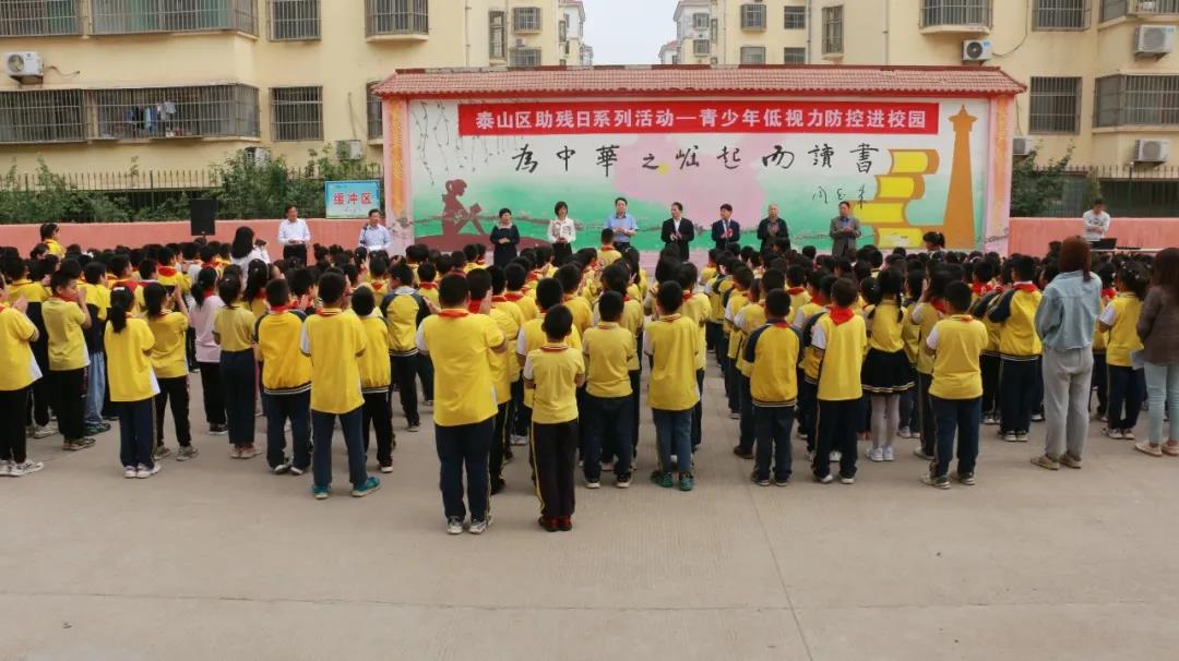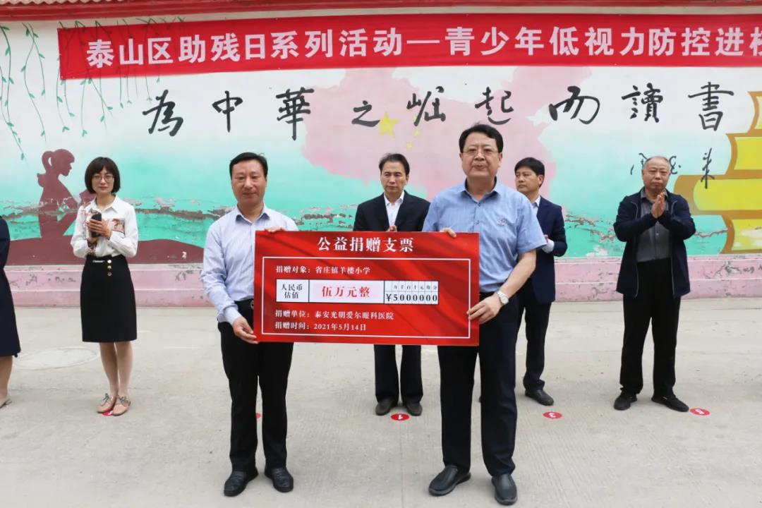 ? ? ? ? 5月14日上午,泰安光明愛爾眼科醫(yī)院數(shù)十位醫(yī)護(hù)人員攜帶相關(guān)設(shè)備與低視力防控產(chǎn)品,驅(qū)車趕往位于泰安市泰山區(qū)省莊鎮(zhèn)的羊樓小學(xué),開展青少年低視力防控進(jìn)校園活動(dòng)。 ? ? ? ? ?此次活動(dòng)是泰山區(qū)殘聯(lián)舉行助殘日系列活動(dòng)的其中一站,是一項(xiàng)以低視力防控、眼健康科普為主要宗旨,以降低校園內(nèi)近視發(fā)生率,呵護(hù)學(xué)生眼健康為目標(biāo)的公益助學(xué)活動(dòng)。 ? ? ? ? ?泰安市殘聯(lián)四級(jí)調(diào)研員李廣喜、泰山區(qū)政府分管領(lǐng)導(dǎo)范玉文、泰安光明愛爾眼科醫(yī)院CEO楊敬昌、泰山區(qū)殘聯(lián)理事長孫超、副理事長劉勝華,省莊鎮(zhèn)副鎮(zhèn)長馬紅、省莊鎮(zhèn)教育委員會(huì)黨委副書記馬長榮,羊樓小學(xué)校長趙光明以及區(qū)殘聯(lián)、愛爾眼科部分醫(yī)護(hù)人員及羊樓小學(xué)教職工和學(xué)生參加此次活動(dòng)?;顒?dòng)由泰山區(qū)殘聯(lián)黨組書記劉長順主持。