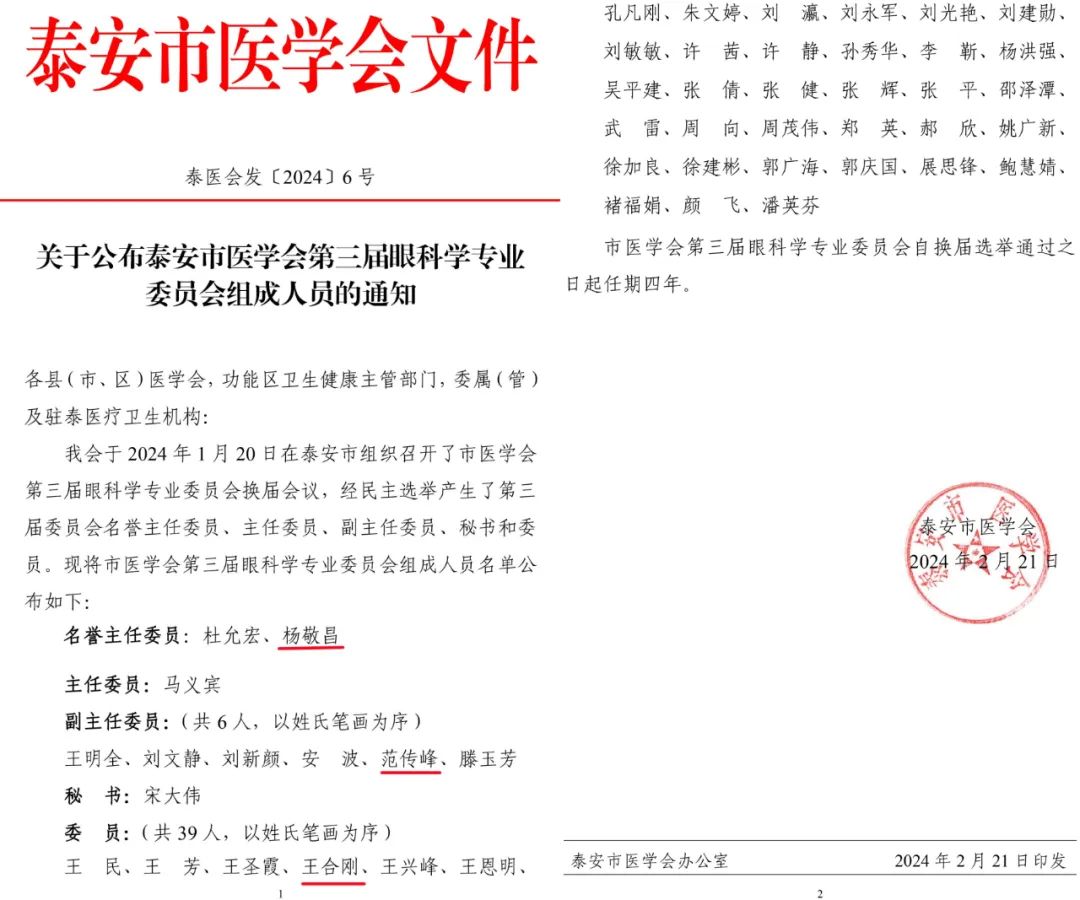? ? ?2月21日,泰安市醫(yī)學(xué)會正式發(fā)文《關(guān)于公布泰安市醫(yī)學(xué)會第三屆眼科學(xué)專業(yè)委員會組成人員的通知》。我院CEO楊敬昌擔(dān)任名譽主任委員、院長范傳峰當(dāng)選副主任委員、副院長王合剛成為委員之一。